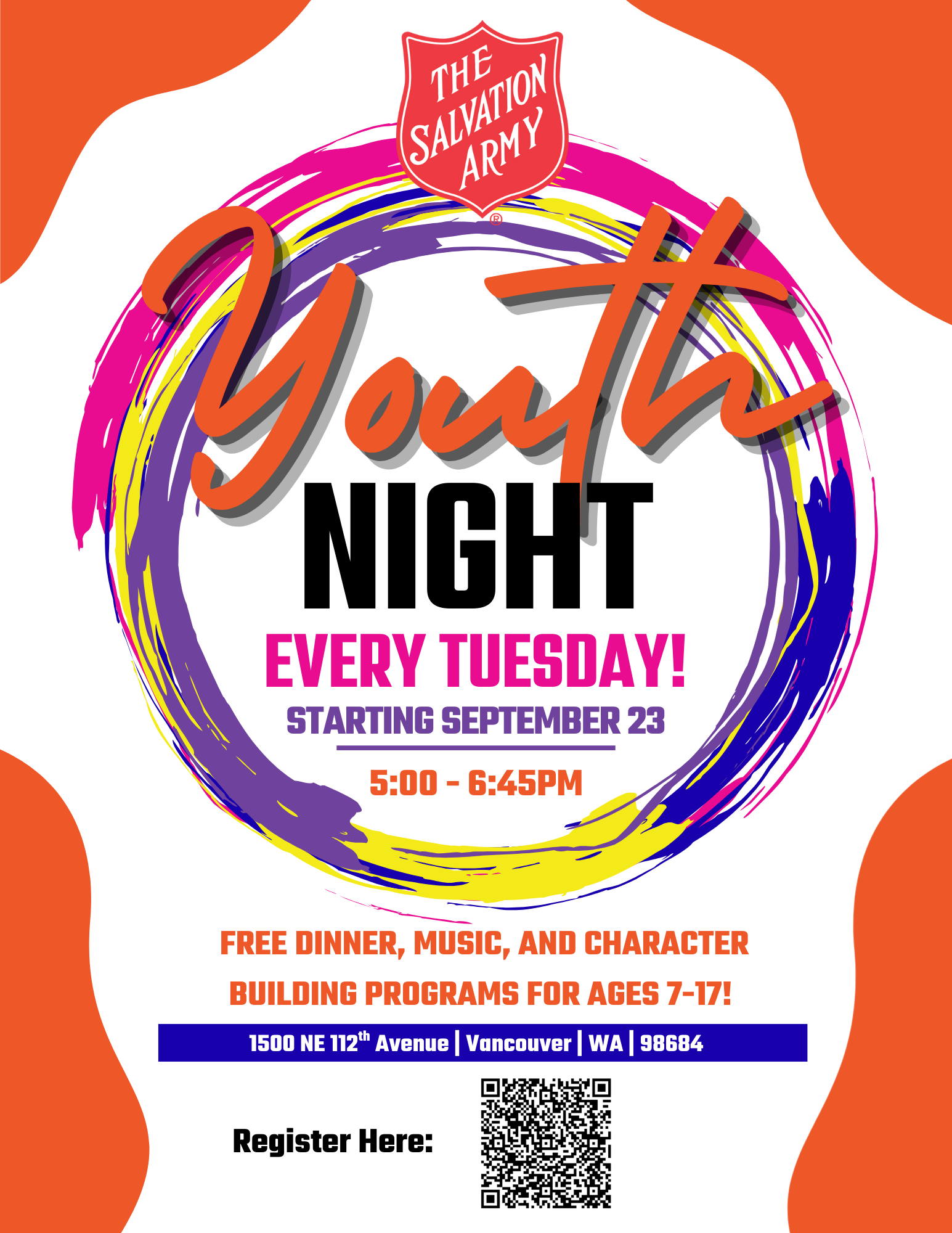 Sign up here: https://form.jotform.com/salvationarmyvanc/TuesdayNightYouthPrograms